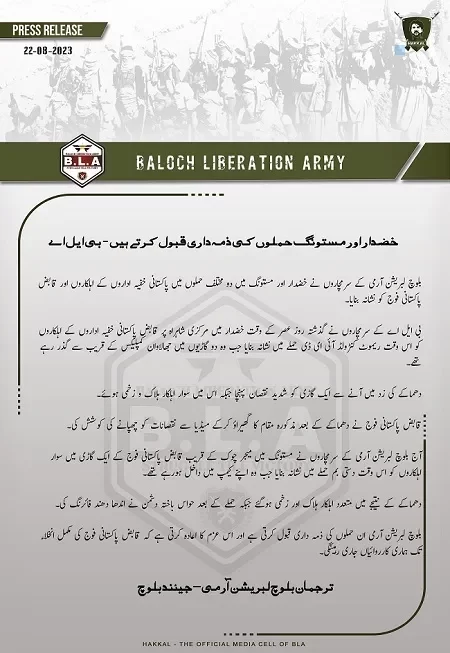 In the statement issued by BLA, spokesperson Jeeyand Baloch has once again committed to continue such attacks till the liberation of Balochistan is not attained. Since decades, BLA has carried on an armed struggle against the Pakistan Army and its agents which has illegally occupied Balochistan. Since 27 March 1948, Pakistan Army is using different undemocratic tactics to oppress Baloch. On one hand, they are exploiting Baloch resources, plundering it and exporting it outside, while on the other, they are depriving Baloch out of their rights. In the process of subverting Baloch, Pakistan Army is profiling Baloch individuals. Any person having a potential to raise questions is either killed or abducted.