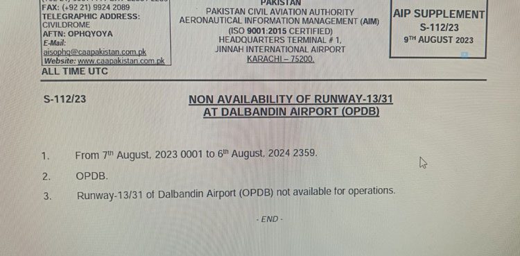 The Civil Aviation Authority (CAA) spokesperson said in a statement that runway number 13/31 at Balochistan’s Dalbandin Airport will be closed for flight operation till August 6, 2024.